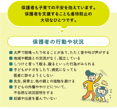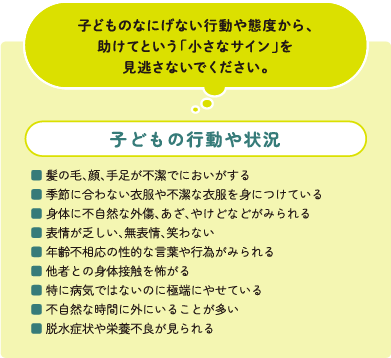 ※上記のサイン・SOSは、虐待が疑われる状況の一例です。当てはまるからといって、ただちに虐待があるとは限りません。